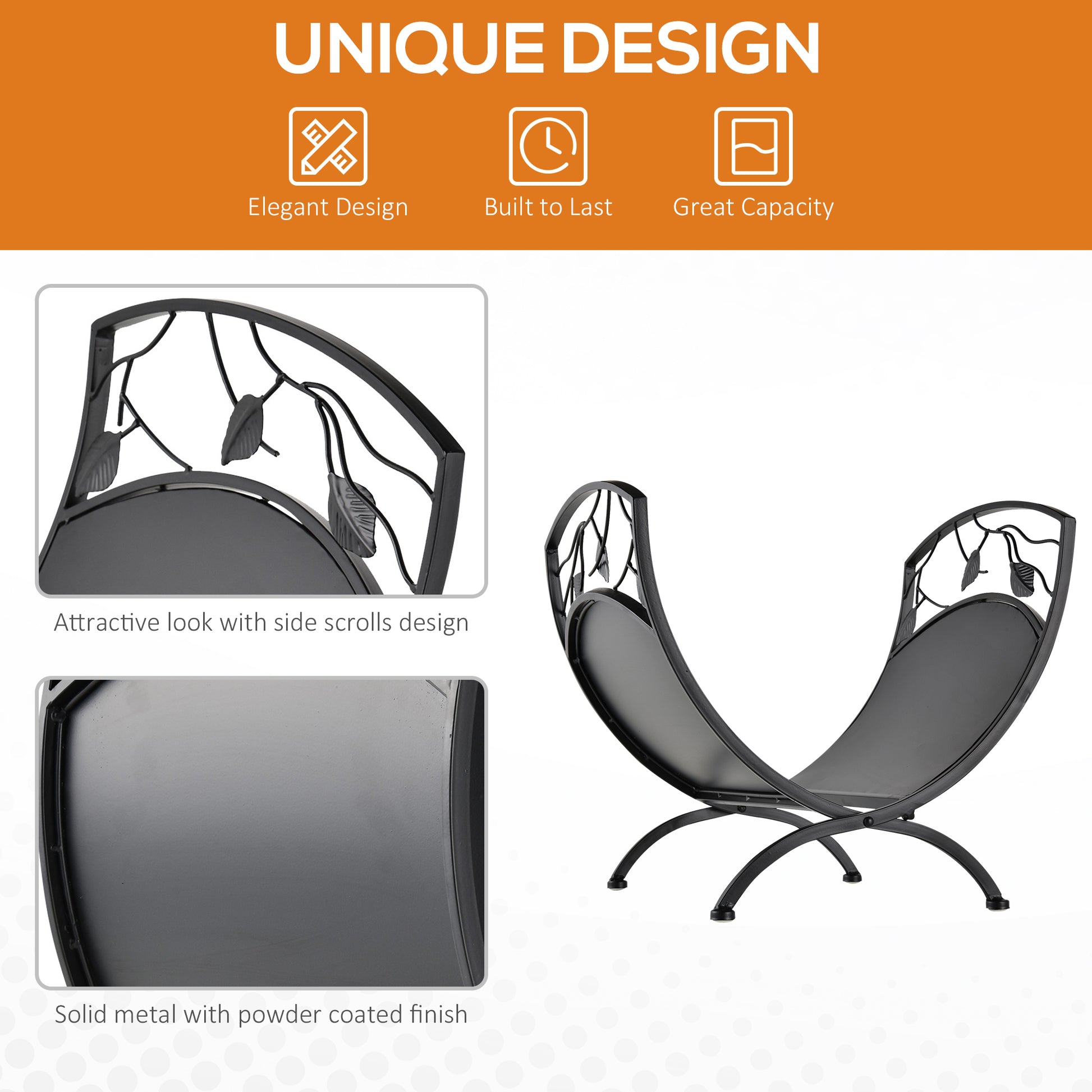 Outsunny Metal Arced Firewood Log Holder Indoor Outdoor Folding Firewood Rack Fireplace Wood Storage Shelf w/ Leaf Pattern Design, Black, 43.5W x 36.5D x 41H cm