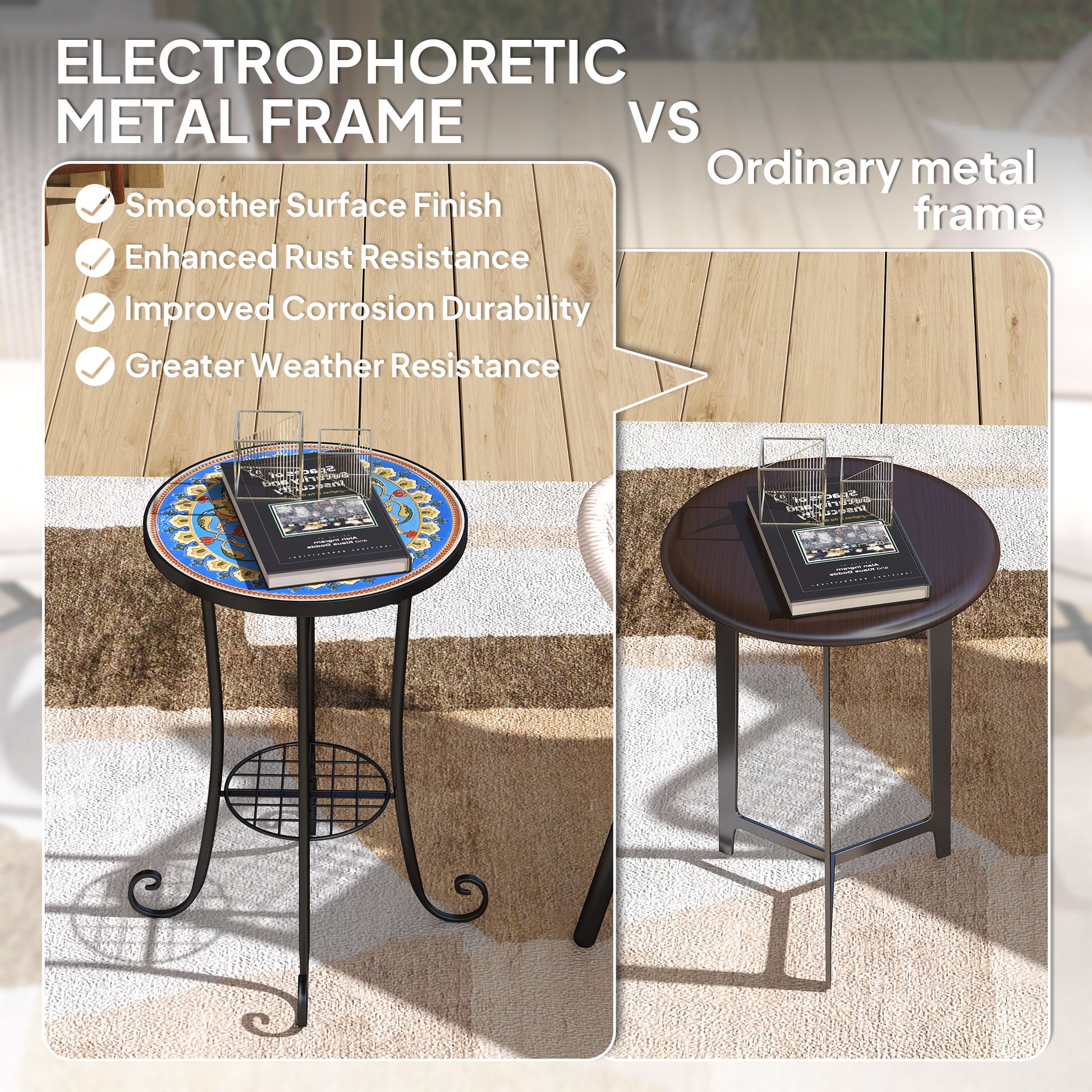 Add a splash of colour to your outdoor space with the Outsunny round garden table. This charming and striking patio table features a vibrant mosaic top and gracefully curved legs. With electrophoretic metal frames, this outdoor side table is strong to resistant water, weather and rust, complete with four legs for plenty of balance. It's not only a fetching small side table or bistro table but also includes a handy lower shelf for displaying plants or decorations.