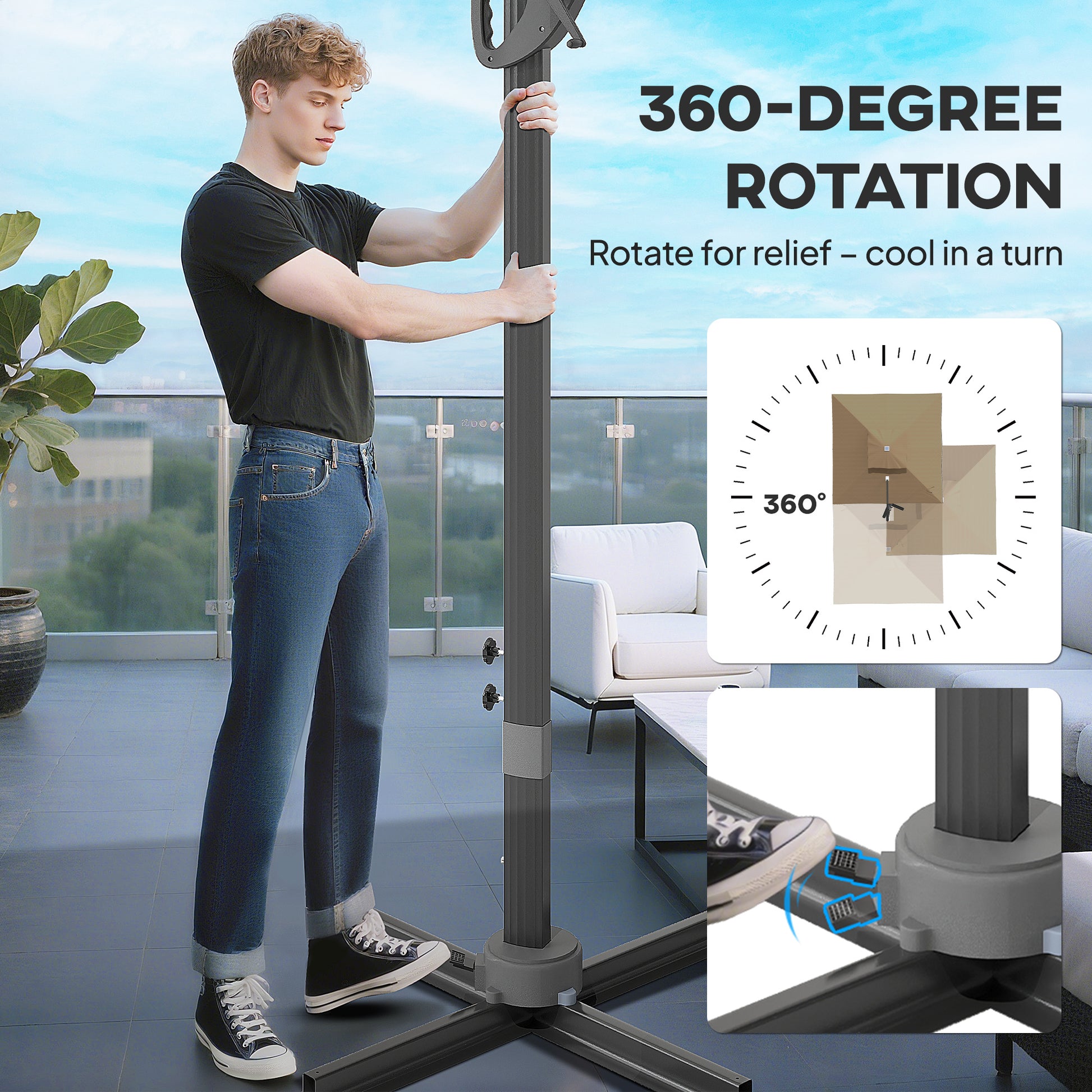 Fitted with solar-powered LED lights, this Outsunny parasol emits a warm white glow - still relax outdoors as the sun sets. The UPF 50+ canopy provides excellent sun protection, while the tiltable design and 360° swivel keep you cool and protected from every angle. Plus, the long strap secures the canopy for easy storage. Cross base included, weights are required.