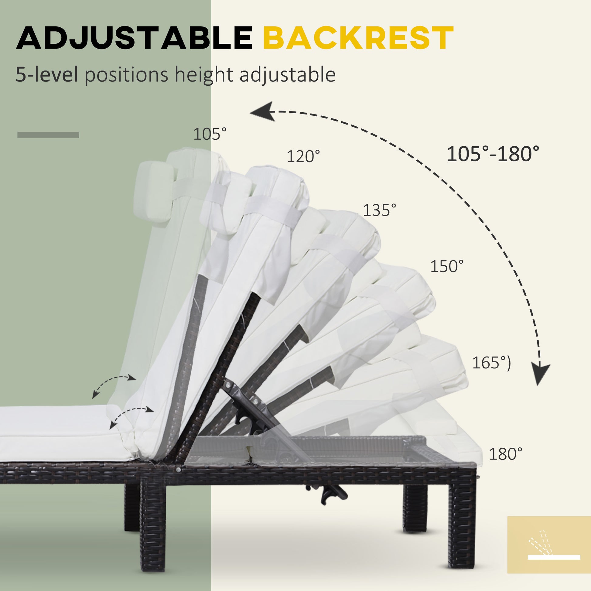 Lounge in luxury, whether in the garden or patio outdoors - thanks to this longline sun seat from Outsunny. Formed of a powder coated metal frame, with PE wicker wrapped around: weather-resistant, durable and beautiful. The back sets to five different positions so you can chose an angle most comfortable for you. The comfortable longline seat comes with a removable cushion; the polyester cover can be washed to keep it clean. Style and comfort, blended into together.