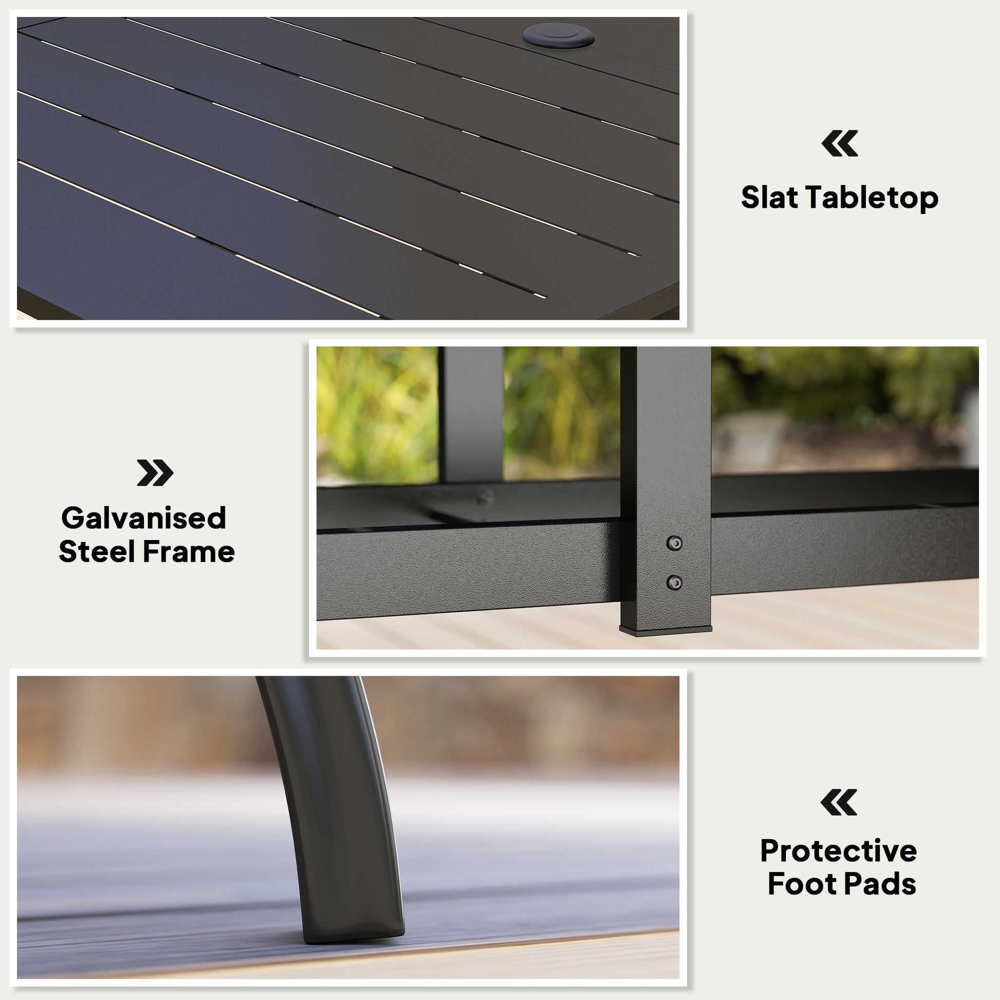 Outsunny Rectangle Garden Dining Table with Parasol Hole, Patio Table with Steel Frame and Slat Tabletop, 150cm x 90cm, Black