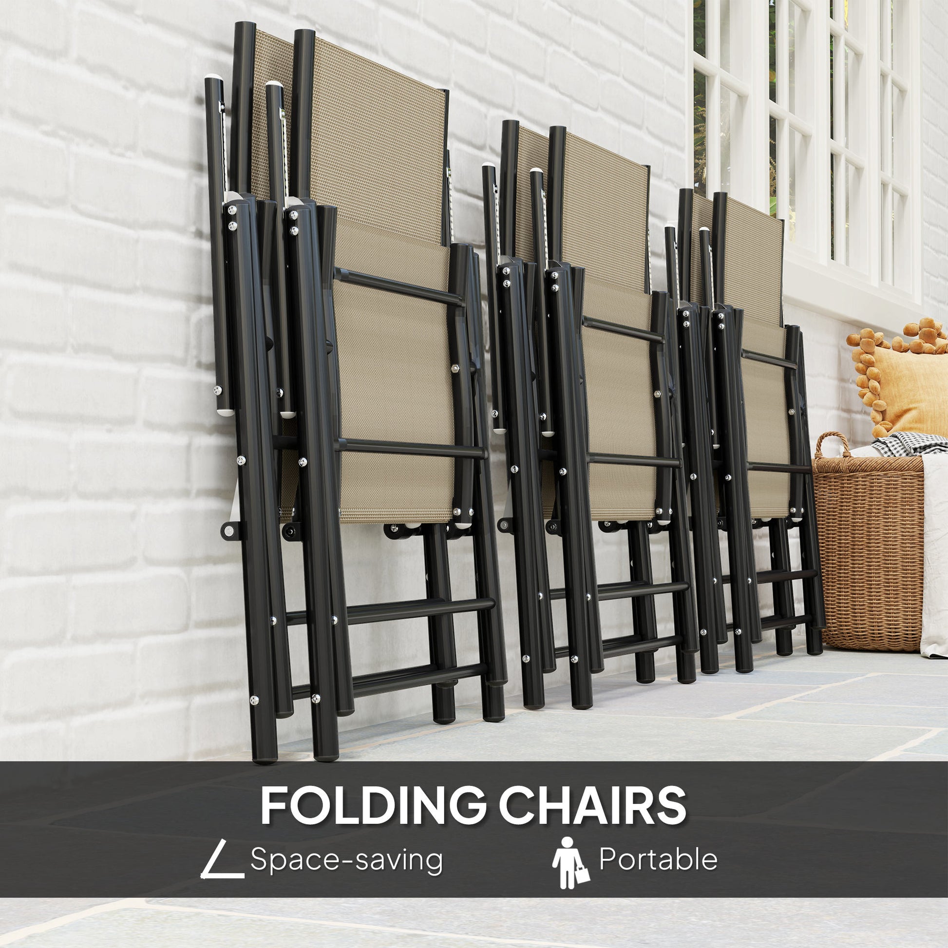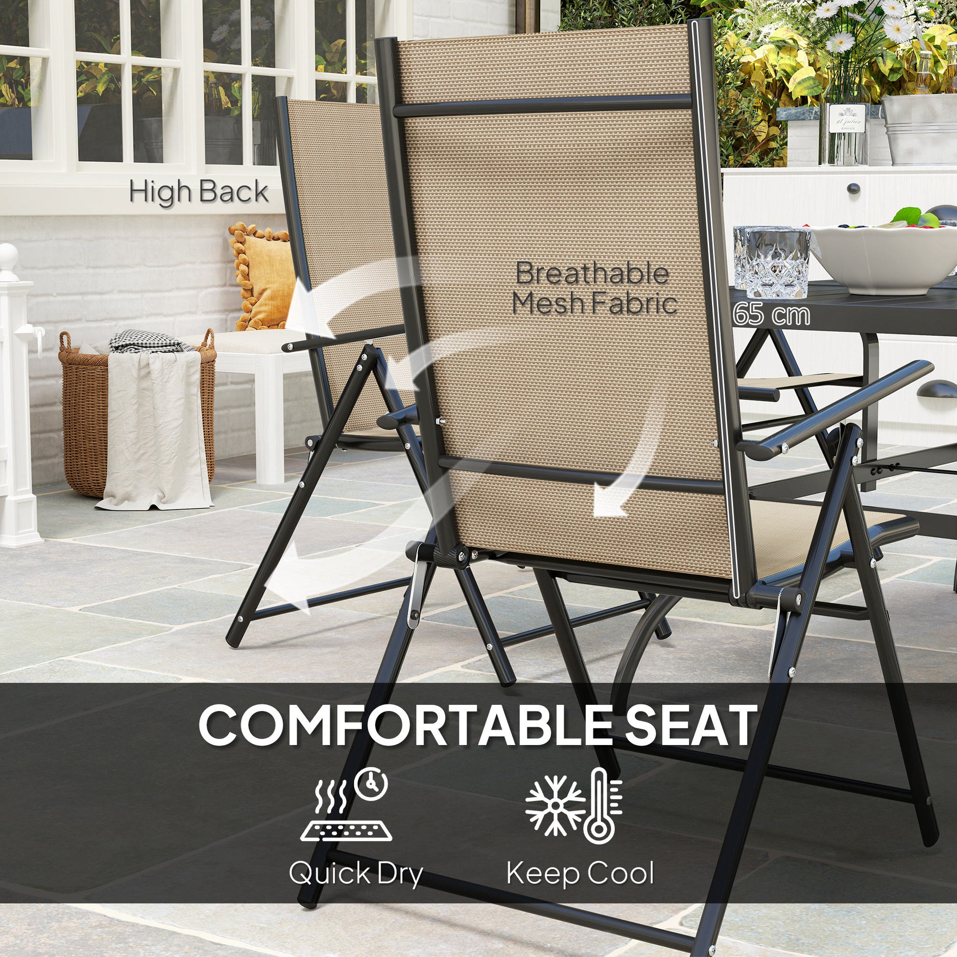 Simple, stylish outdoor dining with this Outsunny outdoor dining table and chairs set. It comes with a rectangular dining table and six matching folding chairs: plenty of room for you and company. The powder coated galvanised steel frames mean the patio table and chairs are strong. The folding chairs save space and come with breathable texteline seats for comfort. This outdoor garden furniture set is complete with Φ50mm hole in the table to hold a parasol umbrella in place.