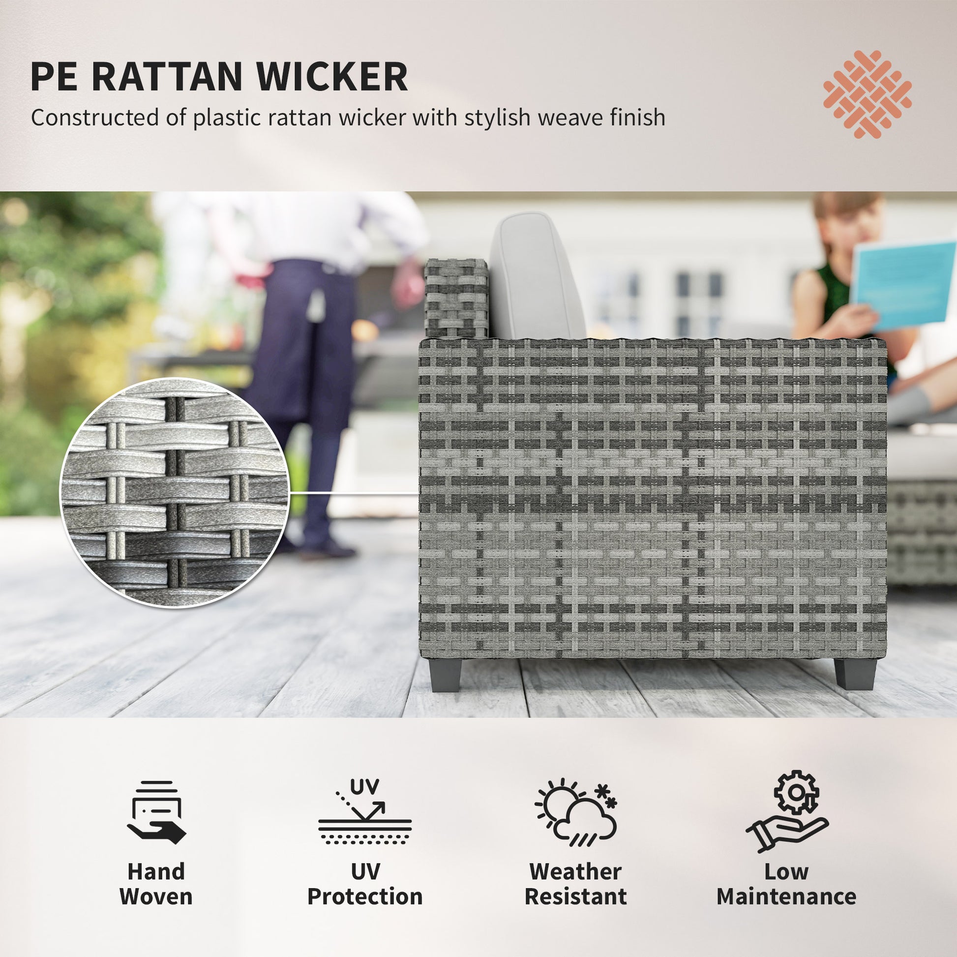 Favourite company gathers round and relaxes in comfort, with this Outsunny six-piece garden sofa set. It comes with two corner chairs, a middle chair, two armchairs and a coffee table - a modular set so you can fix to any shape or position you want. Powder coated steel frames mean a strong core, wrapped in plastic wicker for a stylish and robust rattan look. Complete with seat and back cushions for comfort.