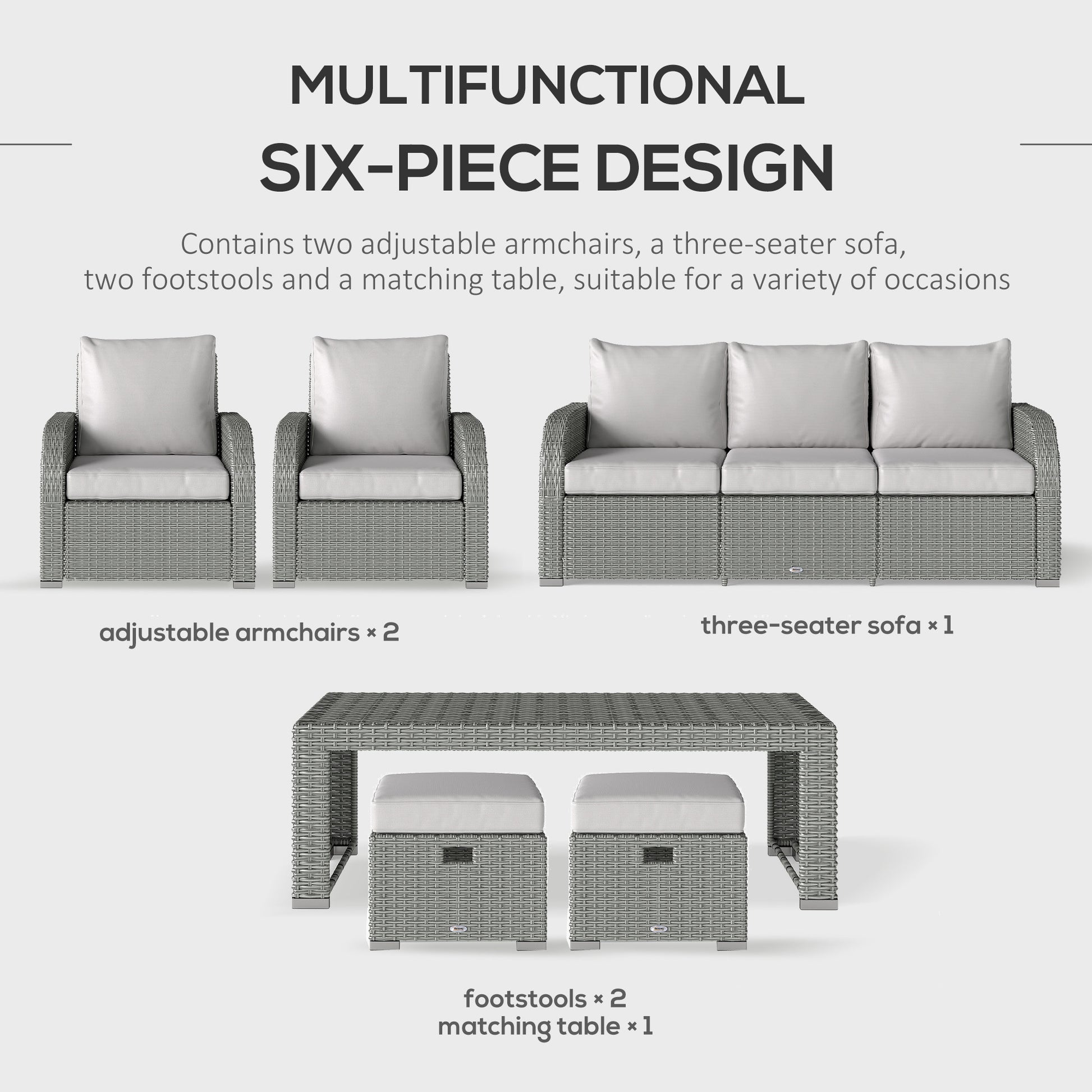 Outsunny Six-piece Outdoor Rattan Dining Set, Outdoor Sofa Set with Reclining Armchairs and Mental Frame, Grey