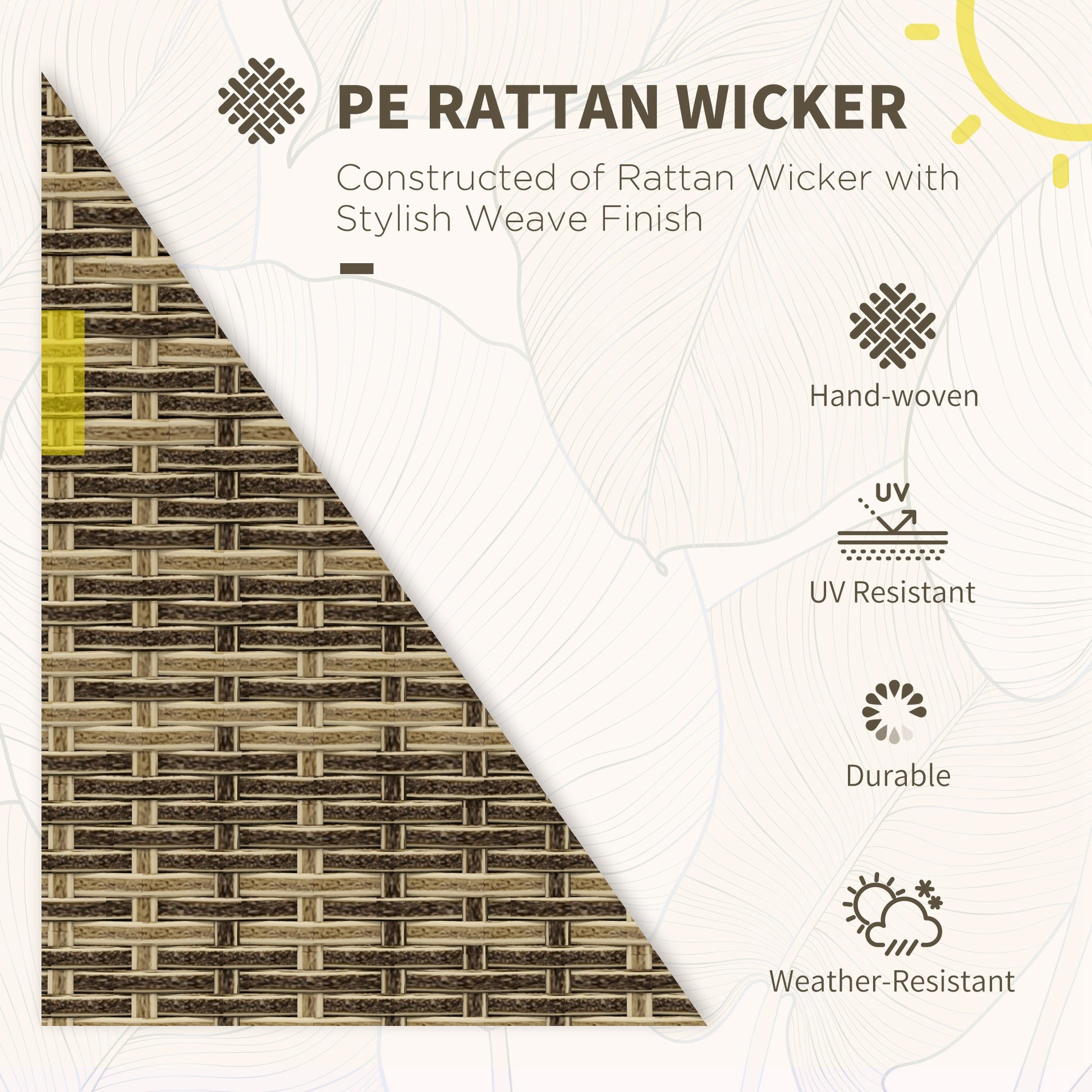 Sink into comfort, all day long. Look to this Outsunny six-piece rattan table and chairs set. Includes a loveseat, two reclining armchairs, two footstools and a two-tier table. The tempered glass top on the table creates a sleek look and a safe dining surface. A versatile outdoor dining set, made for many occasions.