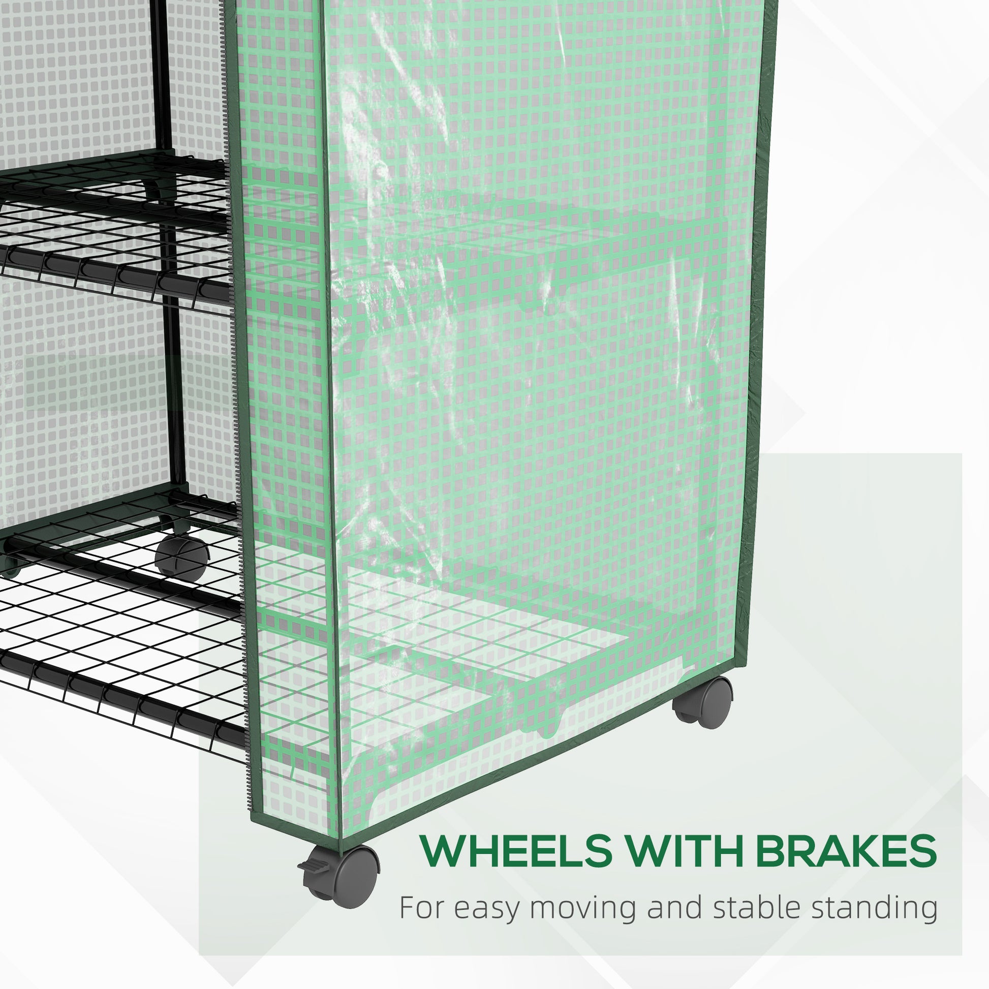 Grow plenty of plants, flowers and vegetables wherever you want, with this Outsunny mini greenhouse. With a steel frame for a strong core, it's formed into a three-tier design so you organise; the mesh shelves means there's no liquid build up so the frame doesn't become damaged. Fitted with a tough three-layer plastic cover to protect growing plants inside, complete with a roll up door to access inside and wheels to move around. Use in the corner of your outdoor spaces - even windowsills!