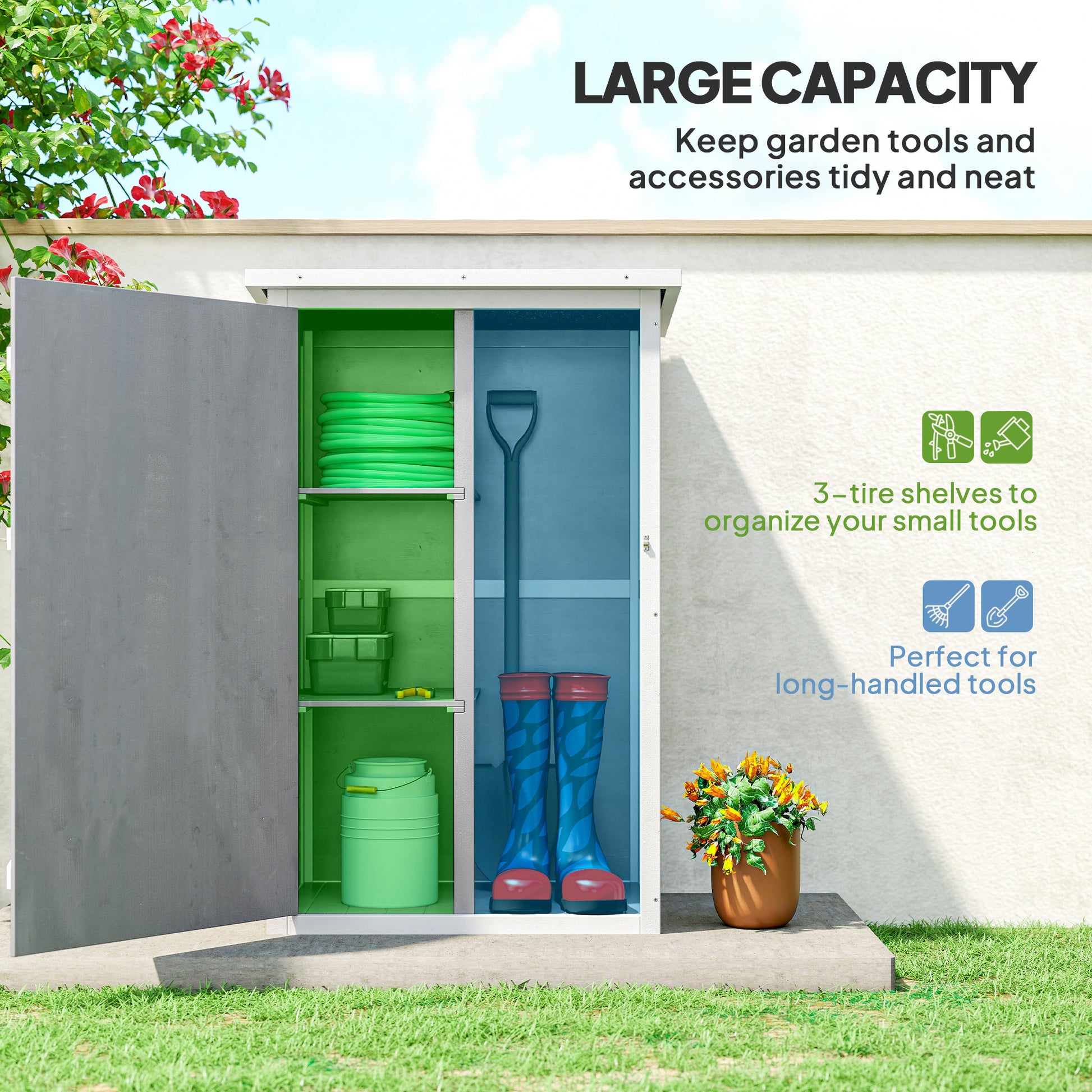 - Spacious interior accommodates gardening tools and outdoor equipment