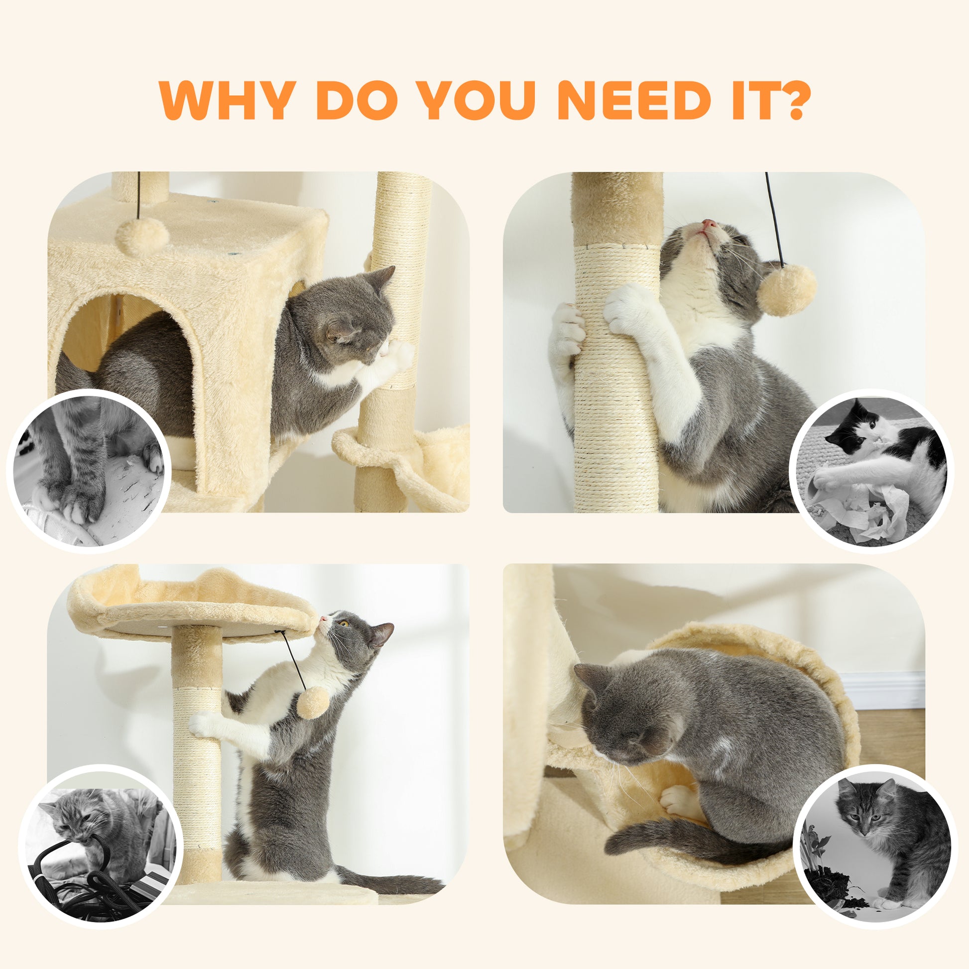 Introduce your cats to endless entertainment and comfort with this PawHut cat tree. It features multiple levels for climbing and jumping, complete with a hanging toy at the top to captivate playful pets. The sisal scratch posts are for clawing, while the cosy perches and private pet house provide comfy spots for relaxation. This cat tree offers a safe haven for climbing, napping and playing, allowing cats to enjoy their activities in safety.