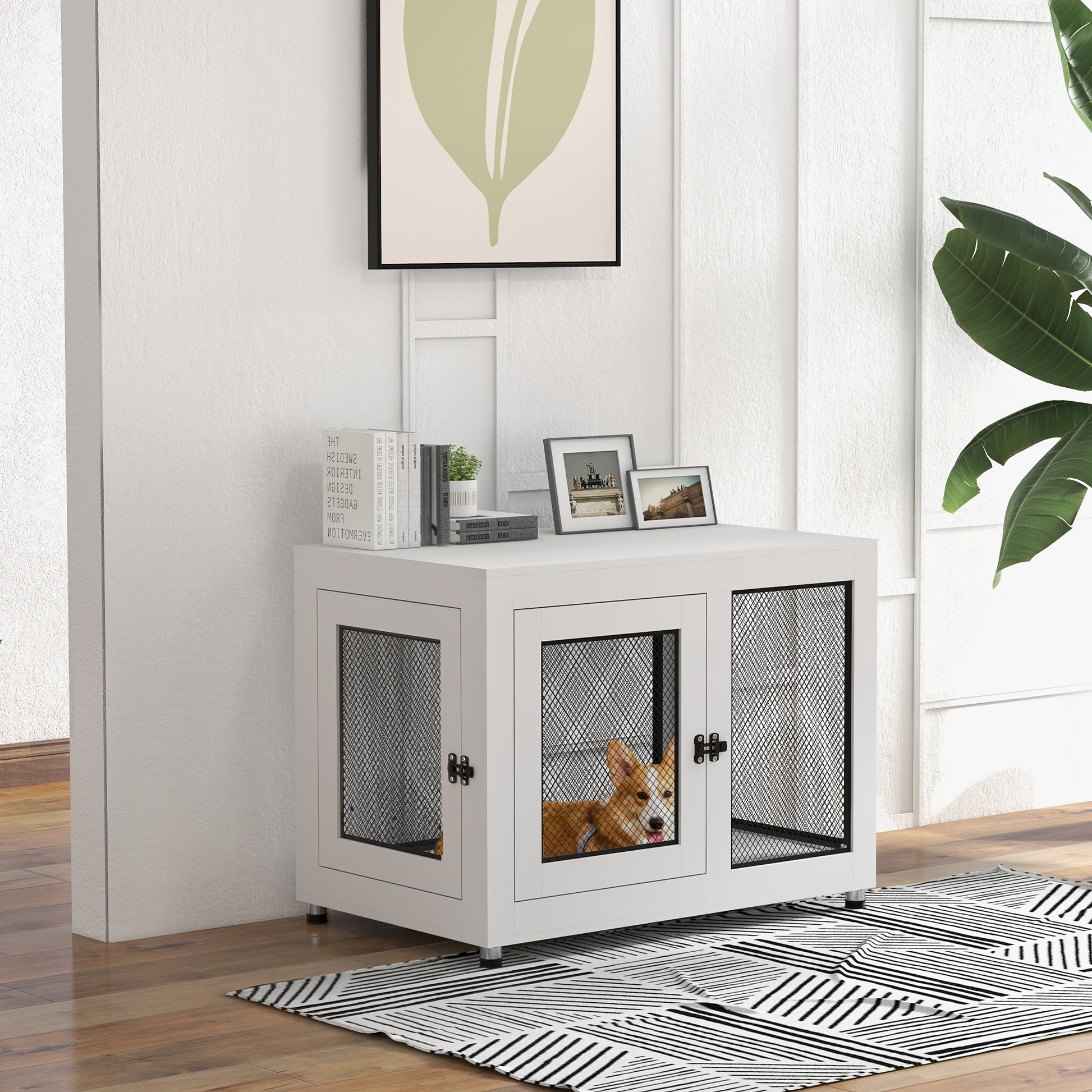 A PawHut dog cage where everyone benefits – pets have a safe and comfortable space to relax, whilst you have a stylish table top to display your favourite pieces. Pets will enter through the front or side door, where they'll lay on the soft, washable cushion, whilst the steel wire lets air flow through to keep them cool – the lockable doors ensure they're secure. A particle board structure, this durable cage has four adjustable feet, keeping it solid and stable; a piece for all to enjoy.