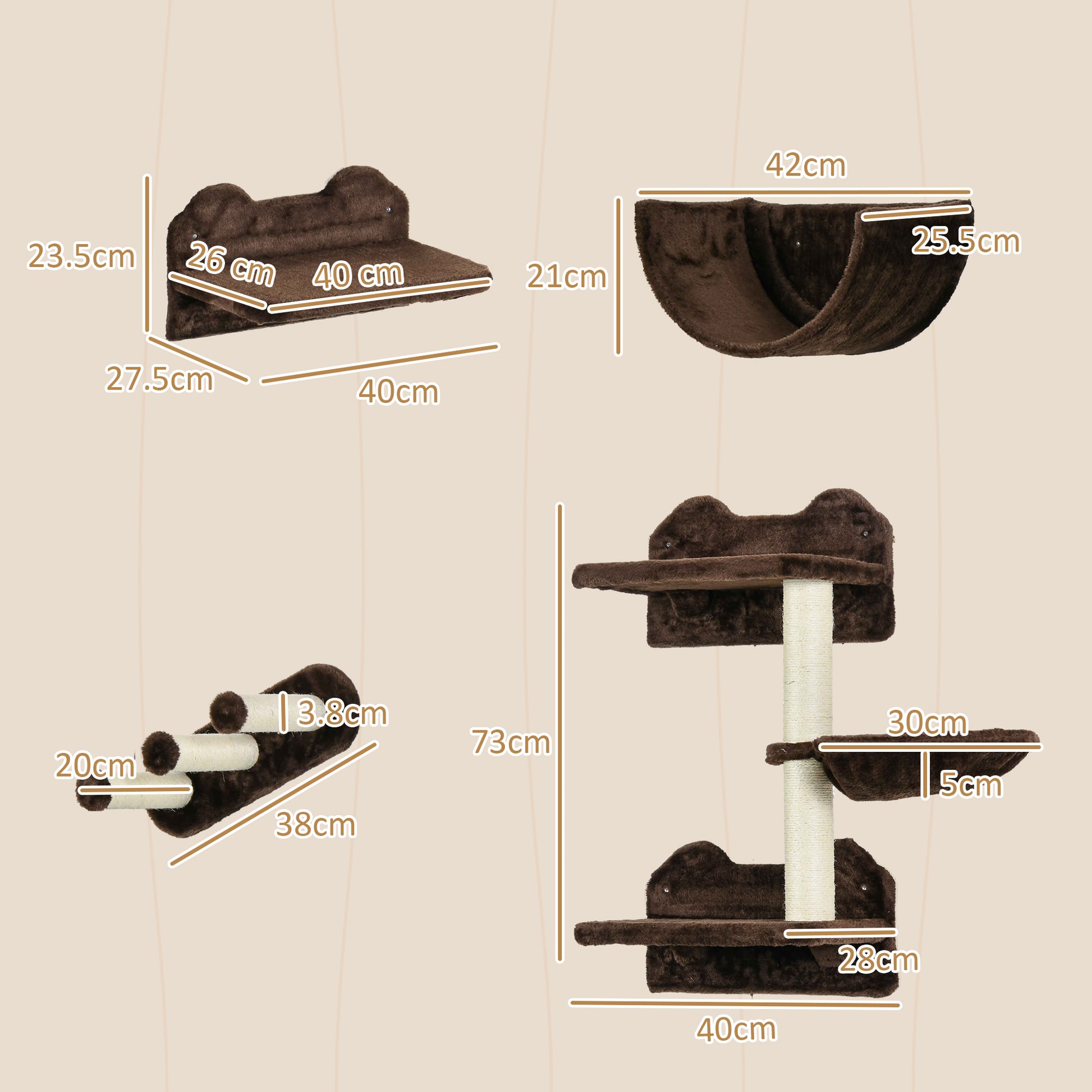 PawHut 4PCs Wall-Mounted Cat Shelves w/ Scratching Post, Hammock, Nest - Brown