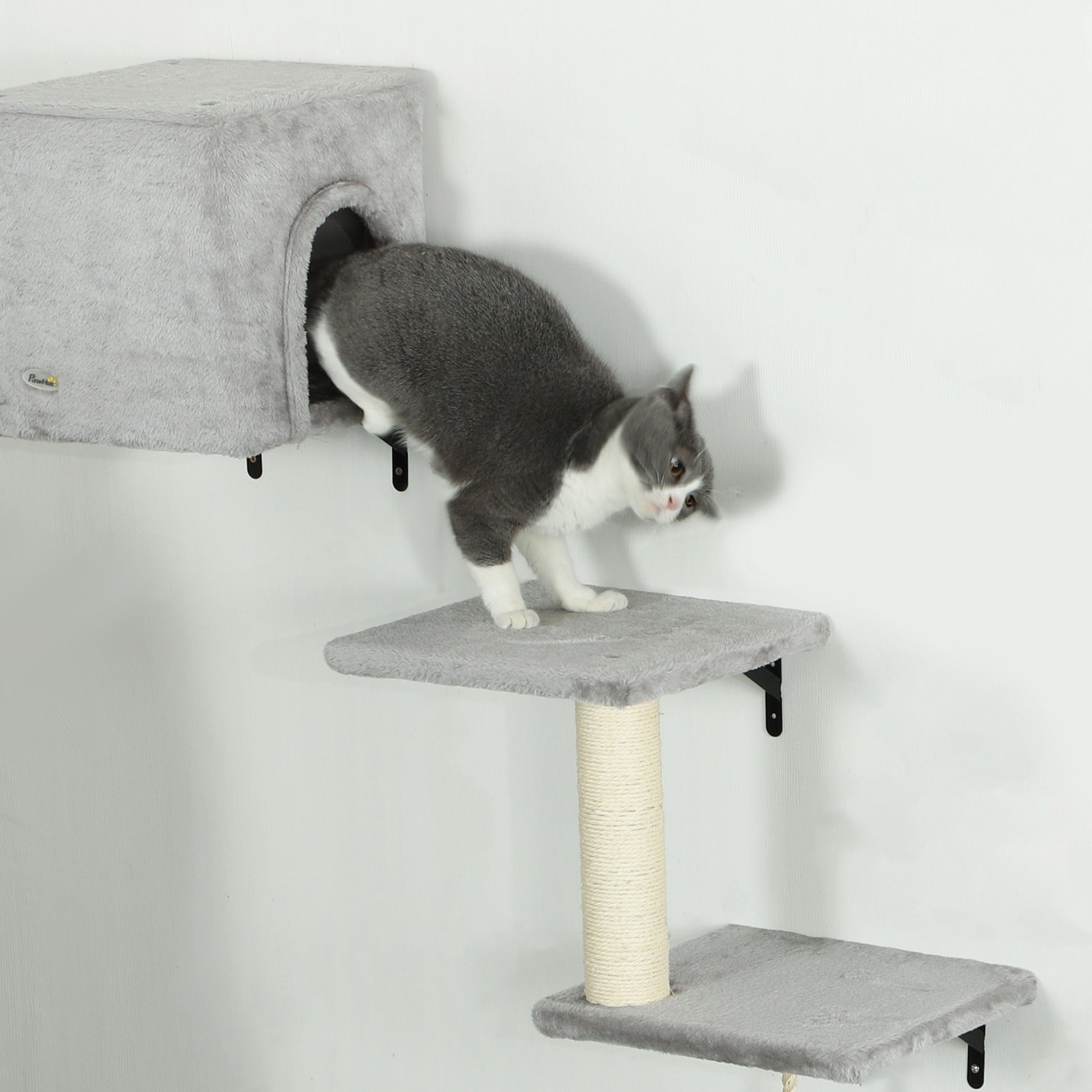 PawHut 6-Piece Cat Wall Shelves Set with Condo, Cat Wall Furniture with Platforms, Sisal Scratching Post, Bed, Toy Ball, Grey