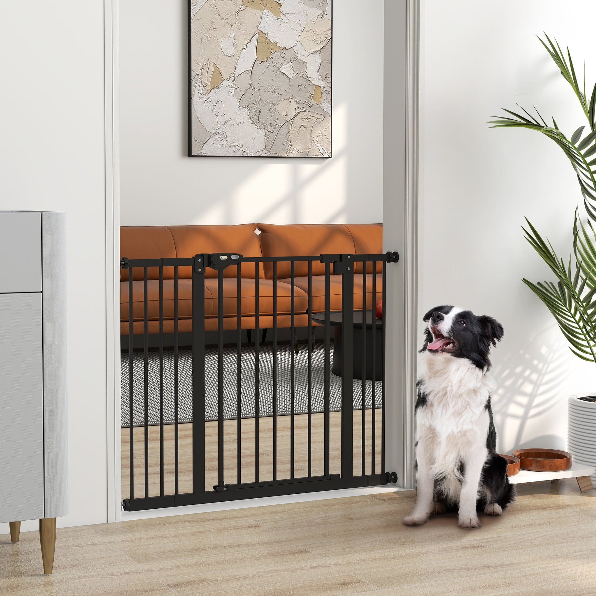 Keep pets safely out of restricted areas with this PawHut pet gate. Designed for hallways, doorways and staircases, its adjustable width fits various openings with ease. The strong metal frame is strong and stable, with a pet-safe, lead-free finish. The door closes and locks automatically when left open between 30°–90°, offering extra peace of mind. With accessories included, setup is quick and simple – great for busy homes with curious pets.