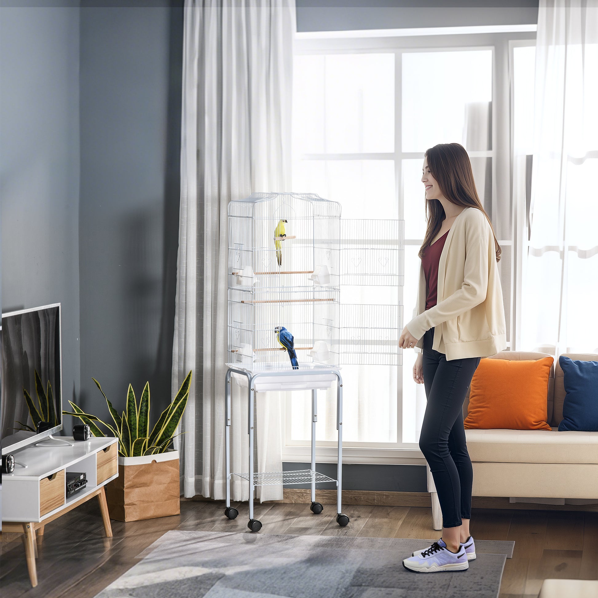 Give your bird this cage they'll love from PawHut. Made from powder-coated metal with four wheels for easy movement, it is crafted into a spacious design that gives your pet plenty of room to move about, along with three wooden perches, a wooden swing and four plastic food containers. Two oversized doors are fitted on the front with sliding food doors to provide you easy access inside the cage with minimal disruption and it is finished with a slide-out tray on the bottom for easy cleaning.
