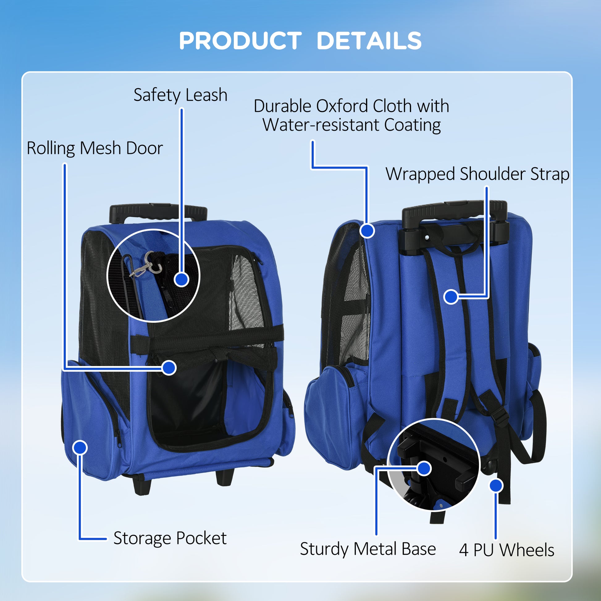 PawHut Pet Travel Backpack Bag Cat Puppy Dog Carrier w/ Trolley and Telescopic Handle Portable Stroller Wheel Luggage Bag (Blue)