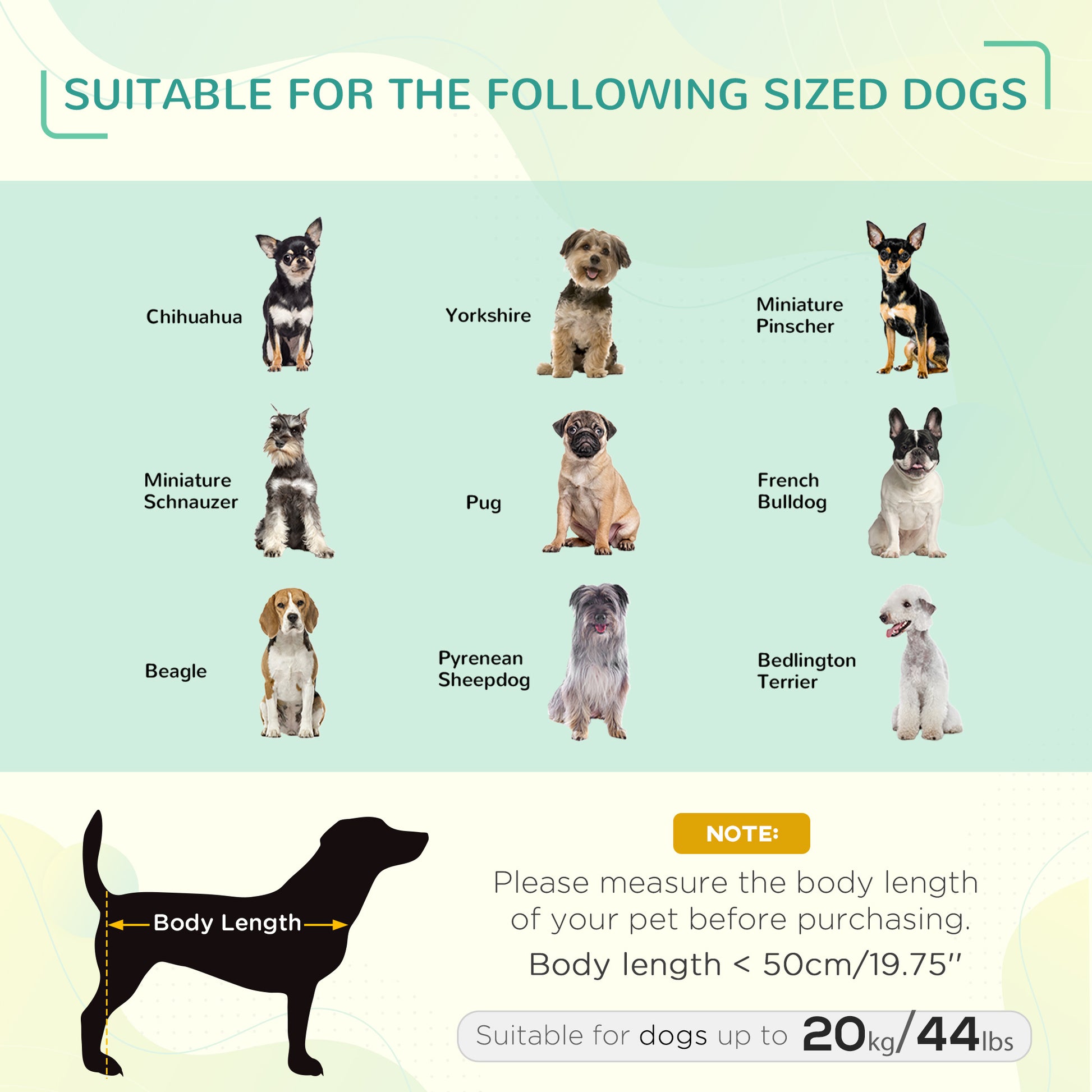 - Suitable for medium dogs less than 50 cm in length and under 20 kg in weight