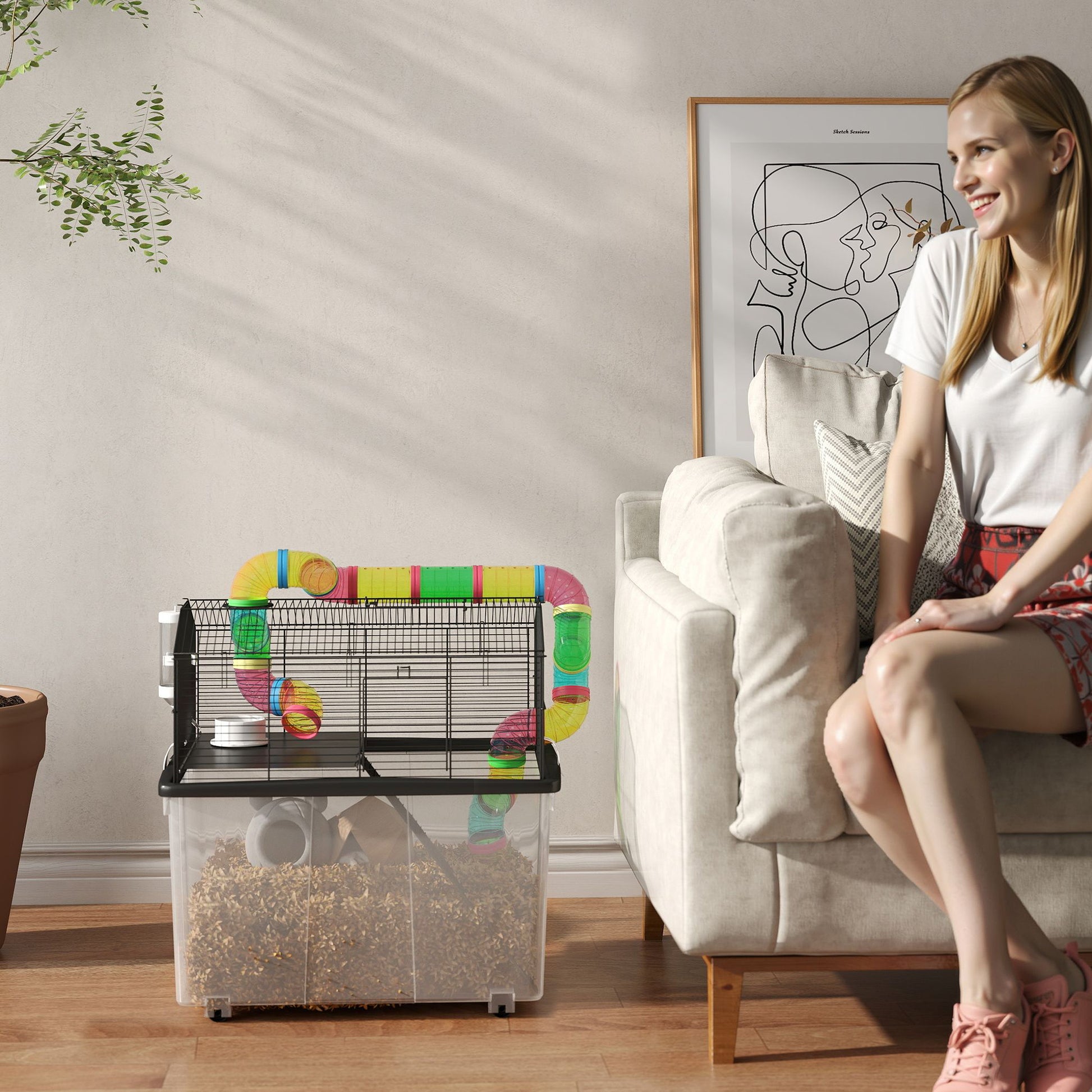 PawHut Two-Tier Hamster Cage with 31cm Deep Tray, Tube System, Water Bottle, Ramp, Feeding Bowl, Multicoloured