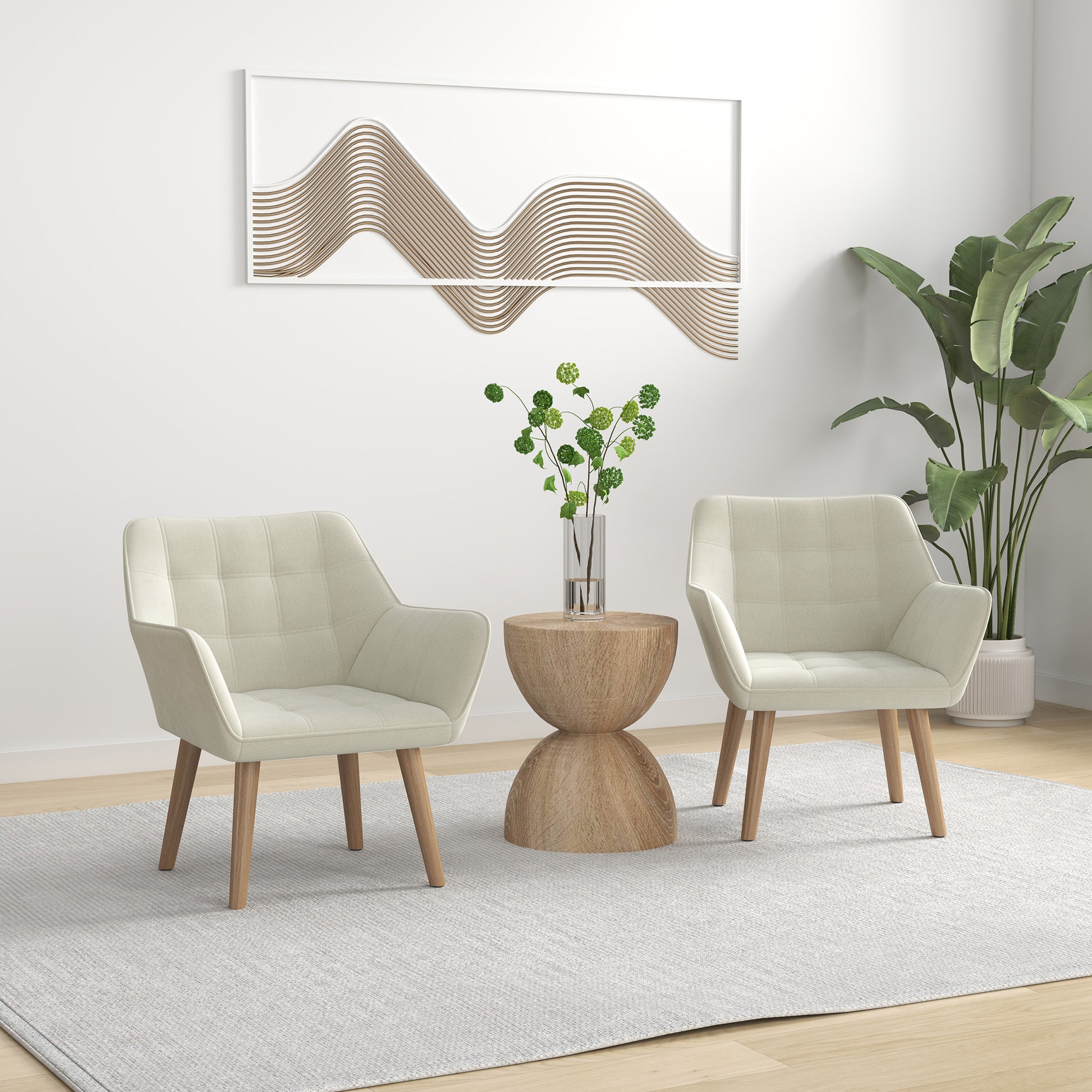 Set of 2 Accent Chair, Arm Chair with Slanted Back, Thick Padding and Rubber Wooden Legs for Living Room, Cream White