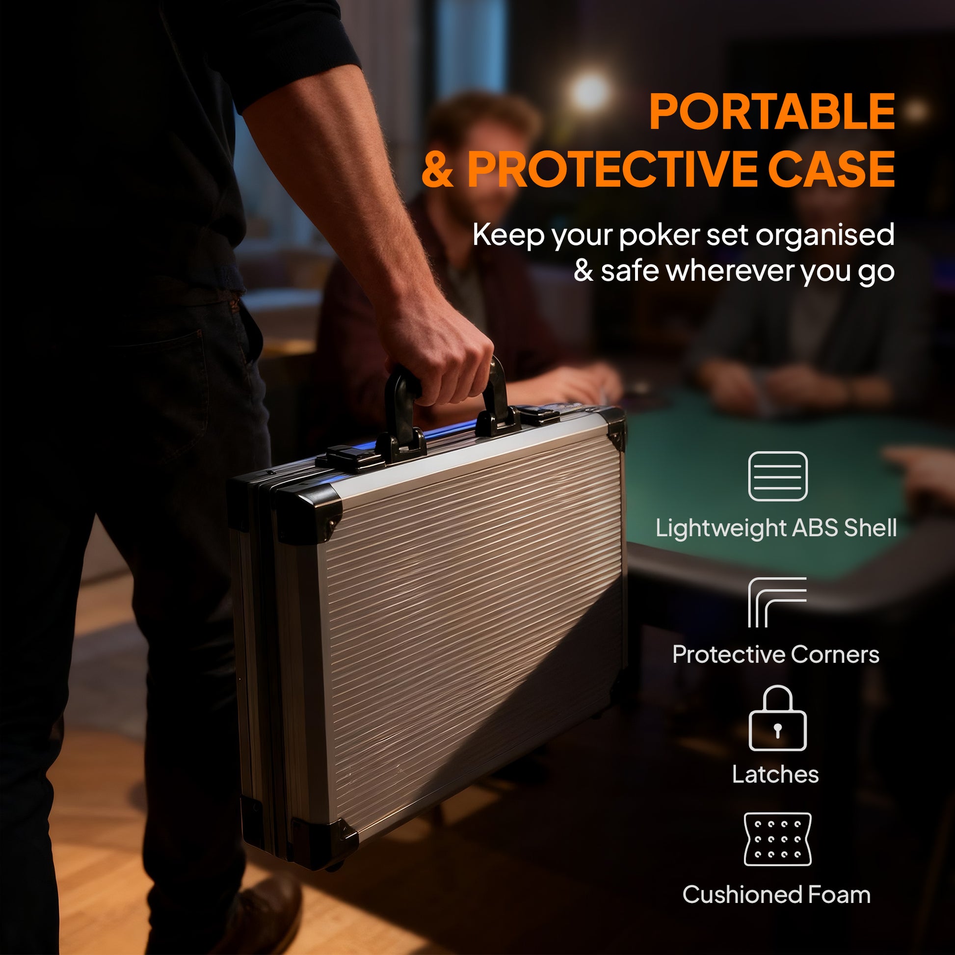 - Lightweight ABS case featuring foam cushioning inserts and plastic chip holder