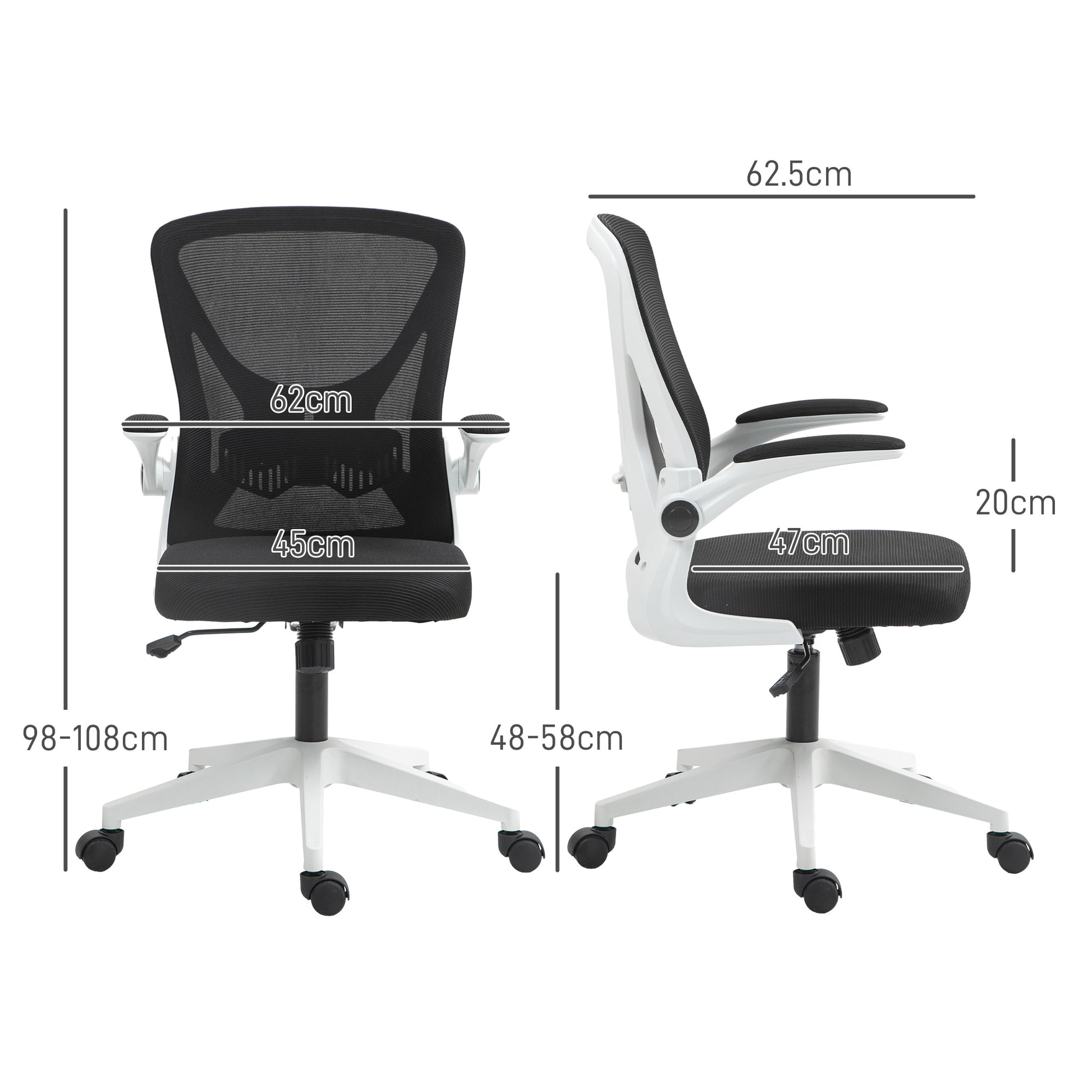 Comfort and functionality comes natural to this Vinsetto desk chair. It's designed to enhance your work experience daily: a curved back to support you, with mesh for ventilation. Flip-up armrests allow the swivel chair to fit neatly under the desk. 98-108cm height range to sit at a level you want. Complete with wheels to move around easily.