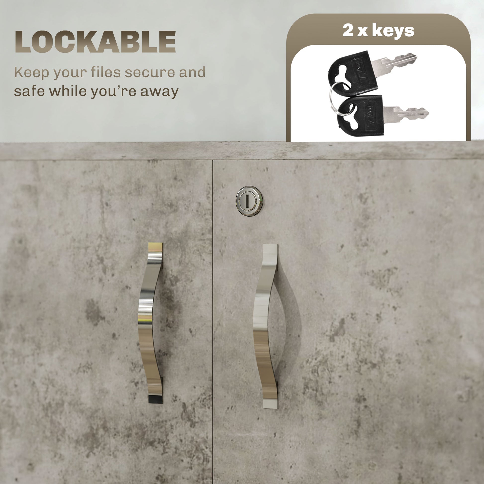 Keep the office organised and the area looking beautiful with this Vinsetto grey storage cabinet. With two hinged doors for easy access, inside a longline shelf sits to create two tiers for organisation of your files and papers. Made from particle board, this piece is tough and reliable for everyday use. It's finished with feet to protect your floor and a lock for security. Comes with two keys.