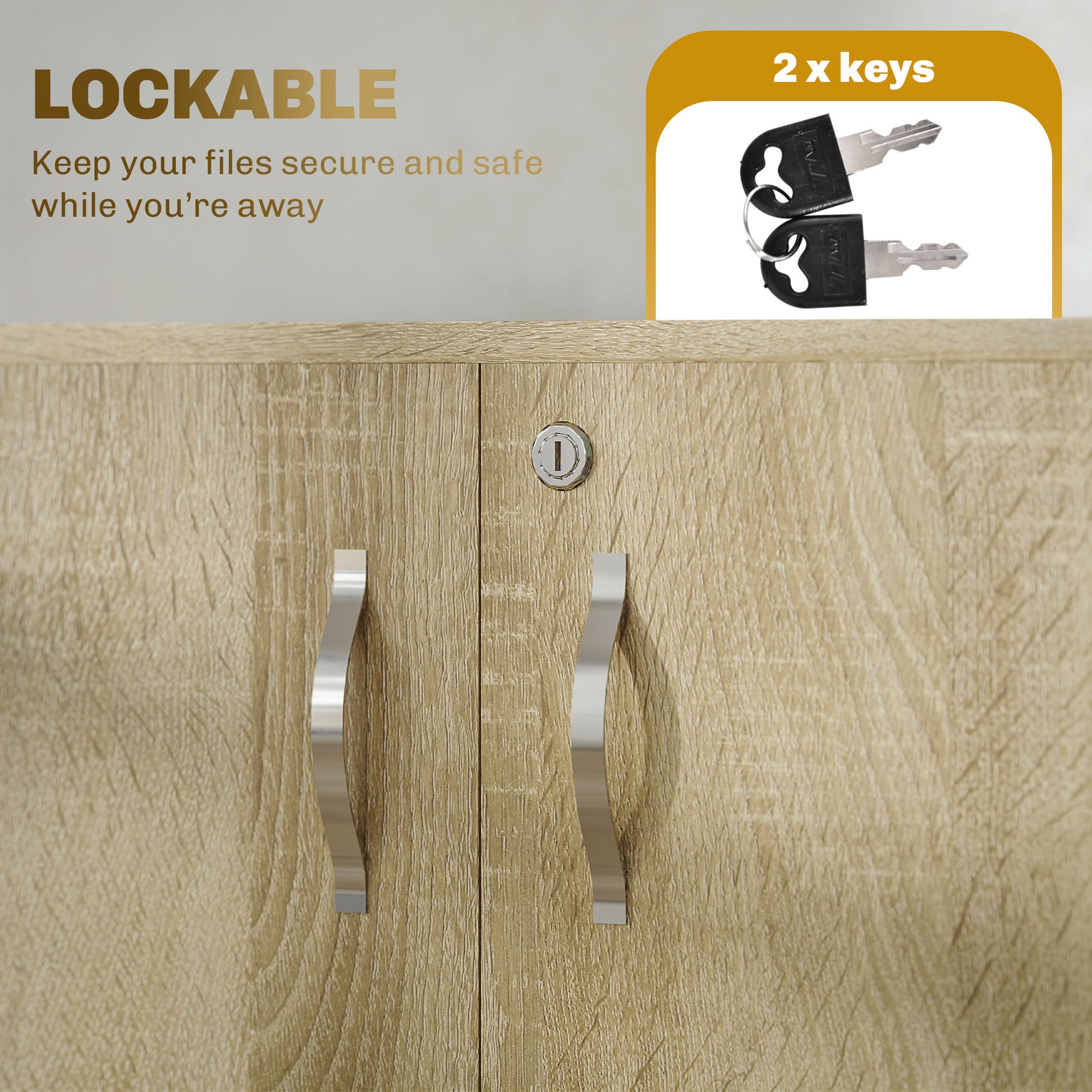 Keep the office organised and the area looking beautiful with this Vinsetto oak storage cabinet. With two hinged doors for easy access, inside a longline shelf sits to create two tiers for organisation of your files and papers. Made from particle board, this piece is tough and reliable for everyday use. It's finished with feet to protect your floor and a lock for security. Comes with two keys.