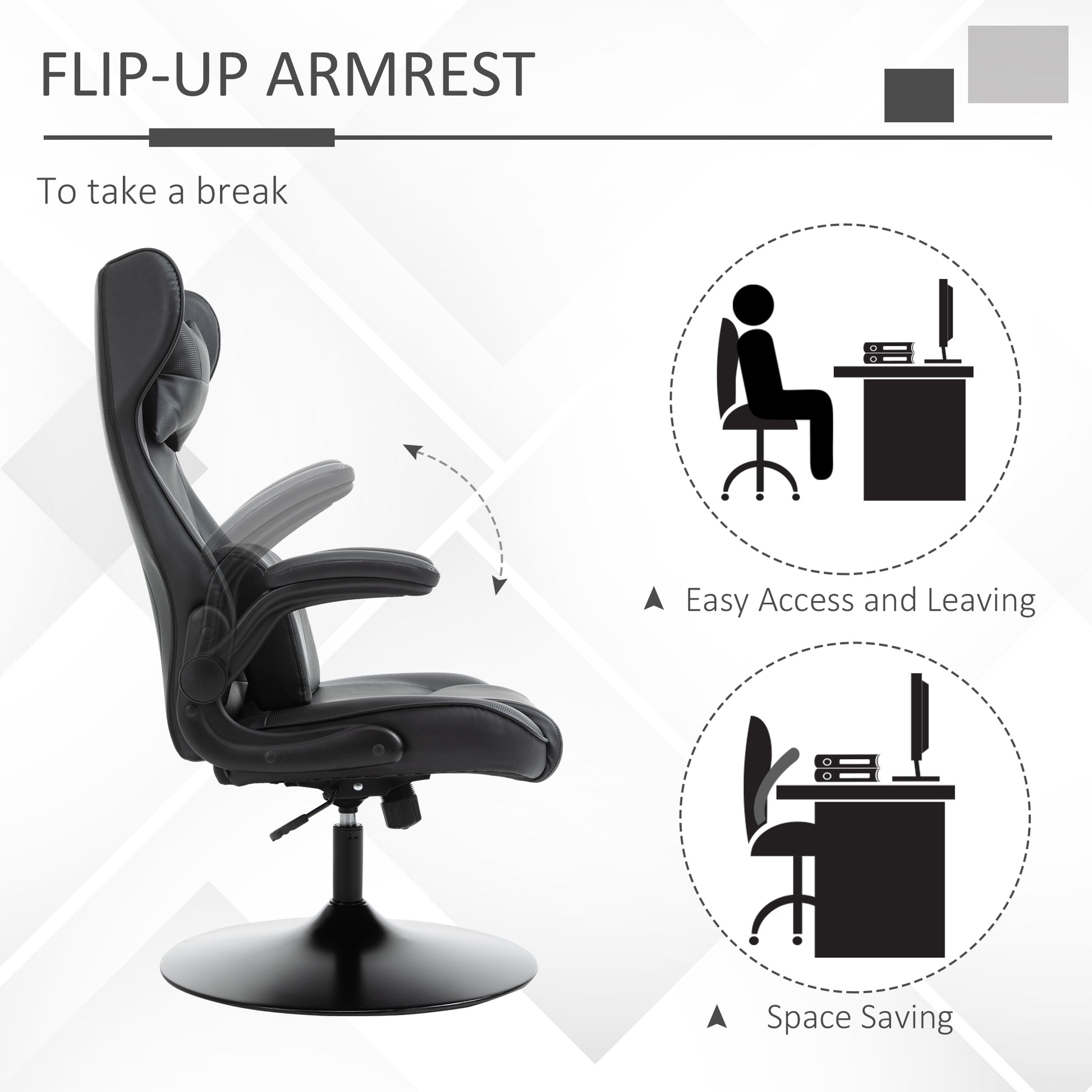 Blending style and comfort, for the gaming room, office and beyond: say hello to this Vinsetto chair. The relaxed shape, faux leather upholstery and swivel base makes it a relaxed, stylish piece: something to both use and look at! Generously padded for comfort, the high back offers support, with flip-up armrests giving you choice. A steel base for support, the 360° swivel works in sync with your body motion.