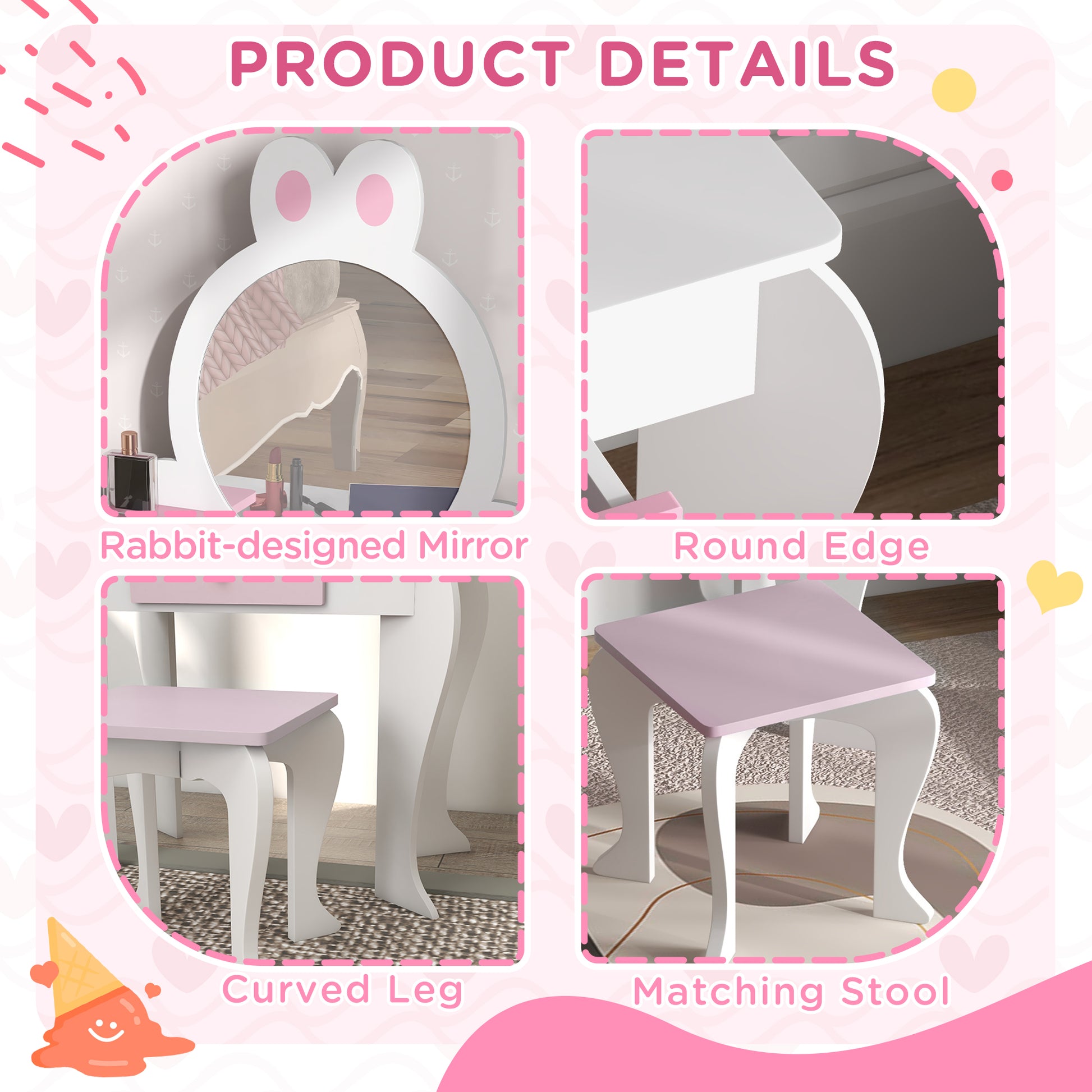 ZONEKIZ Wooden Kids Bedroom Furniture Set with Kids Dressing Table, Stool, Bed, for 3-6 Years, Bunny-Design